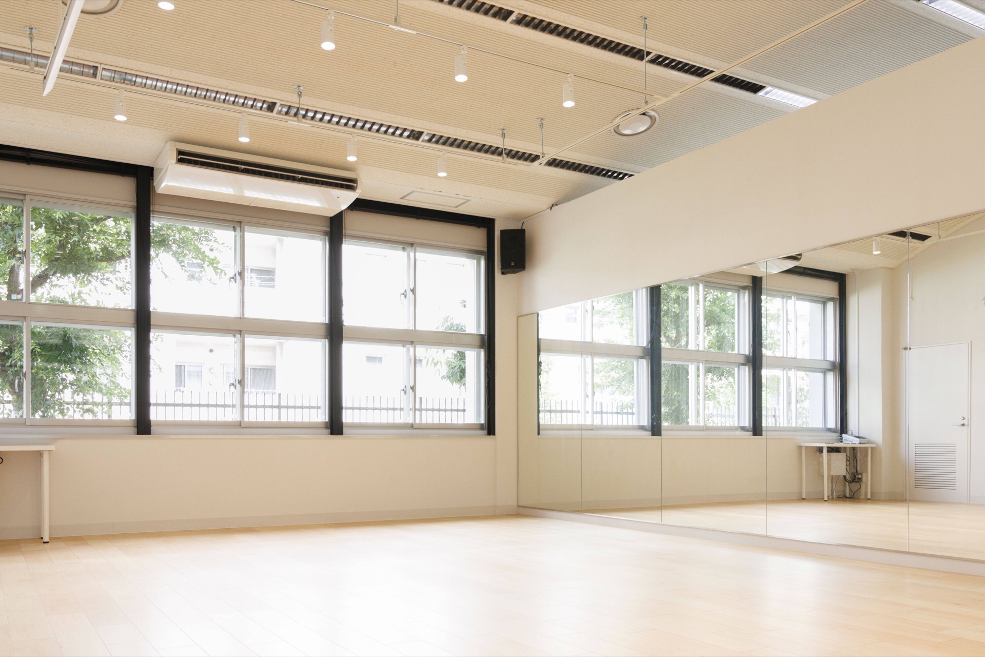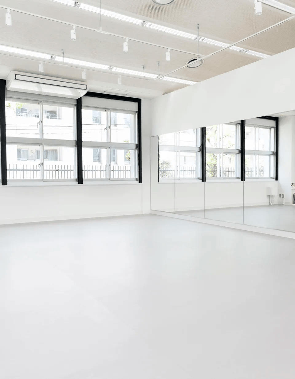 ダンススクールで使用する、壁一面が鏡になった48.2㎡(約29帖)のスタジオです。音響設備を備えるほか、背面にある大型のホワイトボードを利用してセミナーなどの用途でもご利用いただけます。