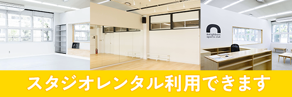 neighbors sports club では、異なる2つのスタジオをレンタルスタジオとしてご利用いただけます。旧校舎の特徴を活かした高いアーチ型の天井や、広い窓からの風景がとても気持ちいいスタジオを是非ご活用ください。